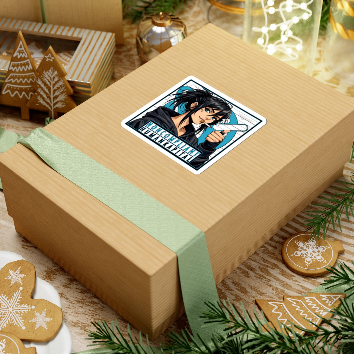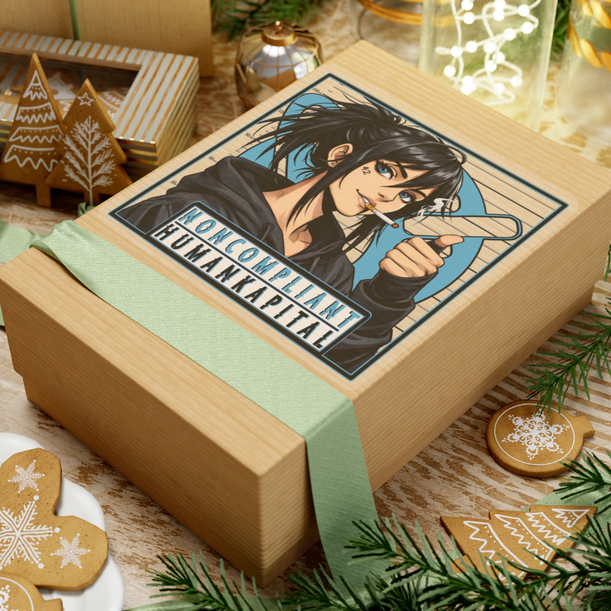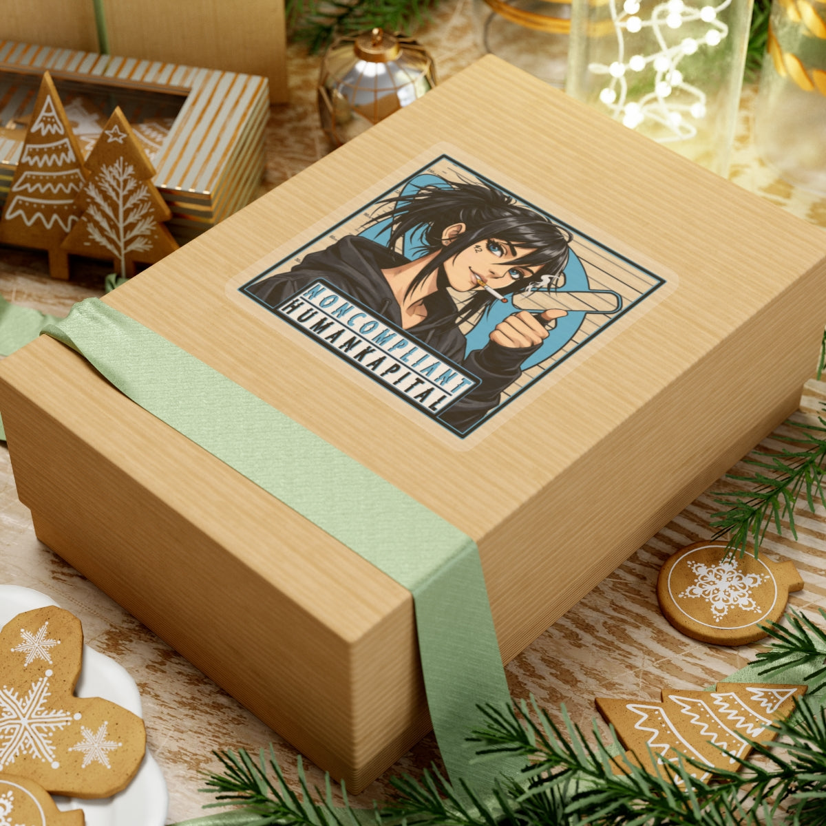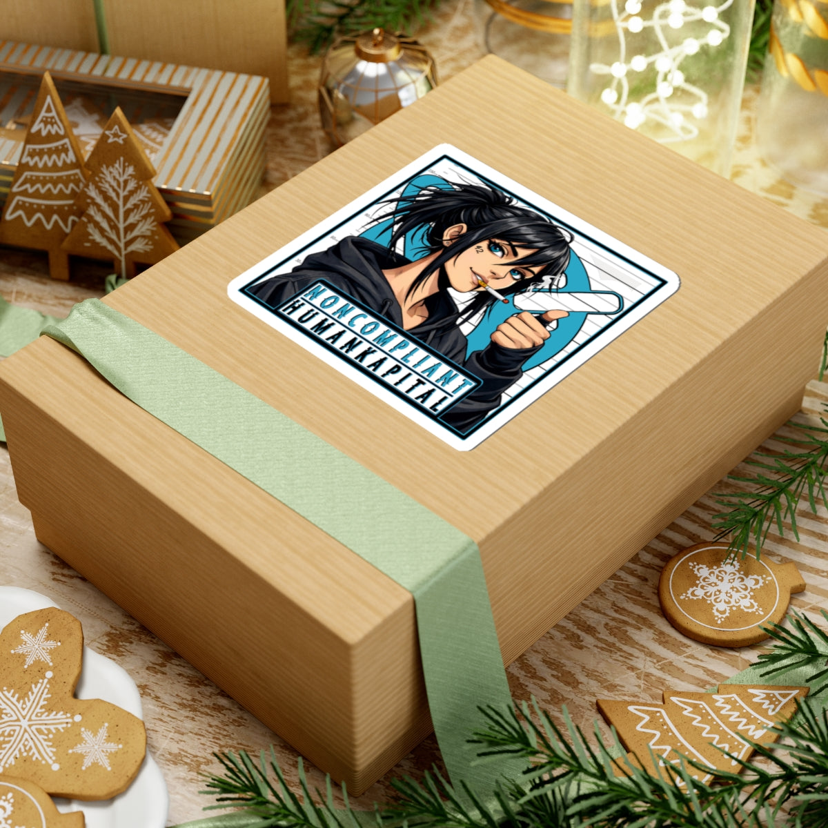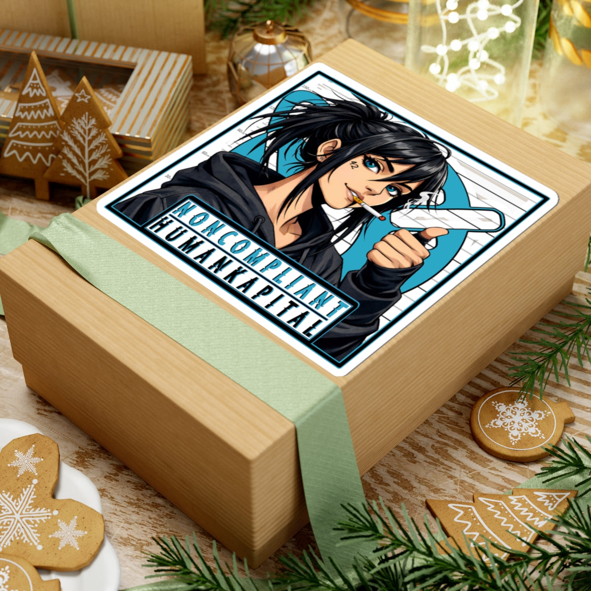 Bold, manga-inspired attitude packed into a glossy kiss-cut sticker. This design features a defiant character smirking into the frame, cigarette in hand, with a stamped ‘NONCOMPLIANT HUMANKAPITAL’ banner that reads like a manifesto. The compact square works as a statement on laptops, journals, water-resistant tech cases, or a curated sticker collage. Colors stay vibrant thanks to eco-solvent inks and a glossy finish that catches light and keeps the lines sharp. It’s made from durable vinyl with strong acrylic adhesive for confident placement on smooth, flat surfaces — just peel, place, and press for a smooth, bubble-free result. Choose white or transparent backing and one of four sizes to match your setup.