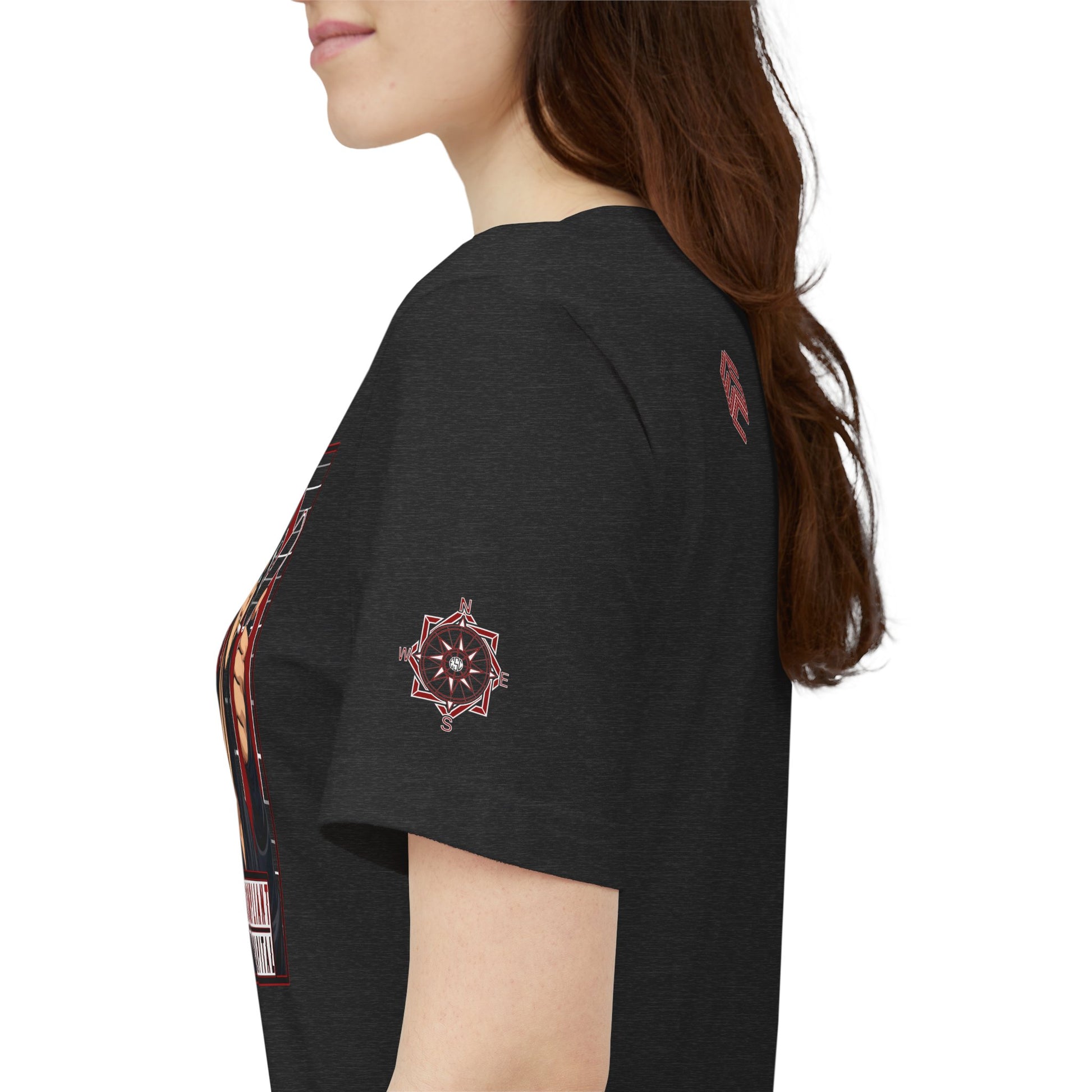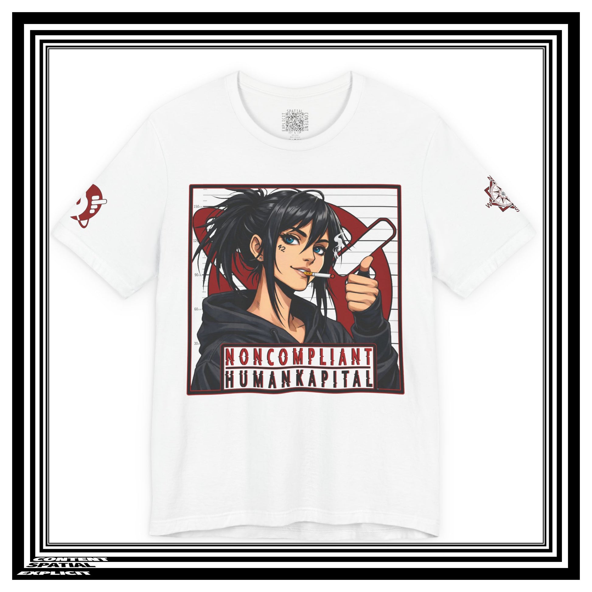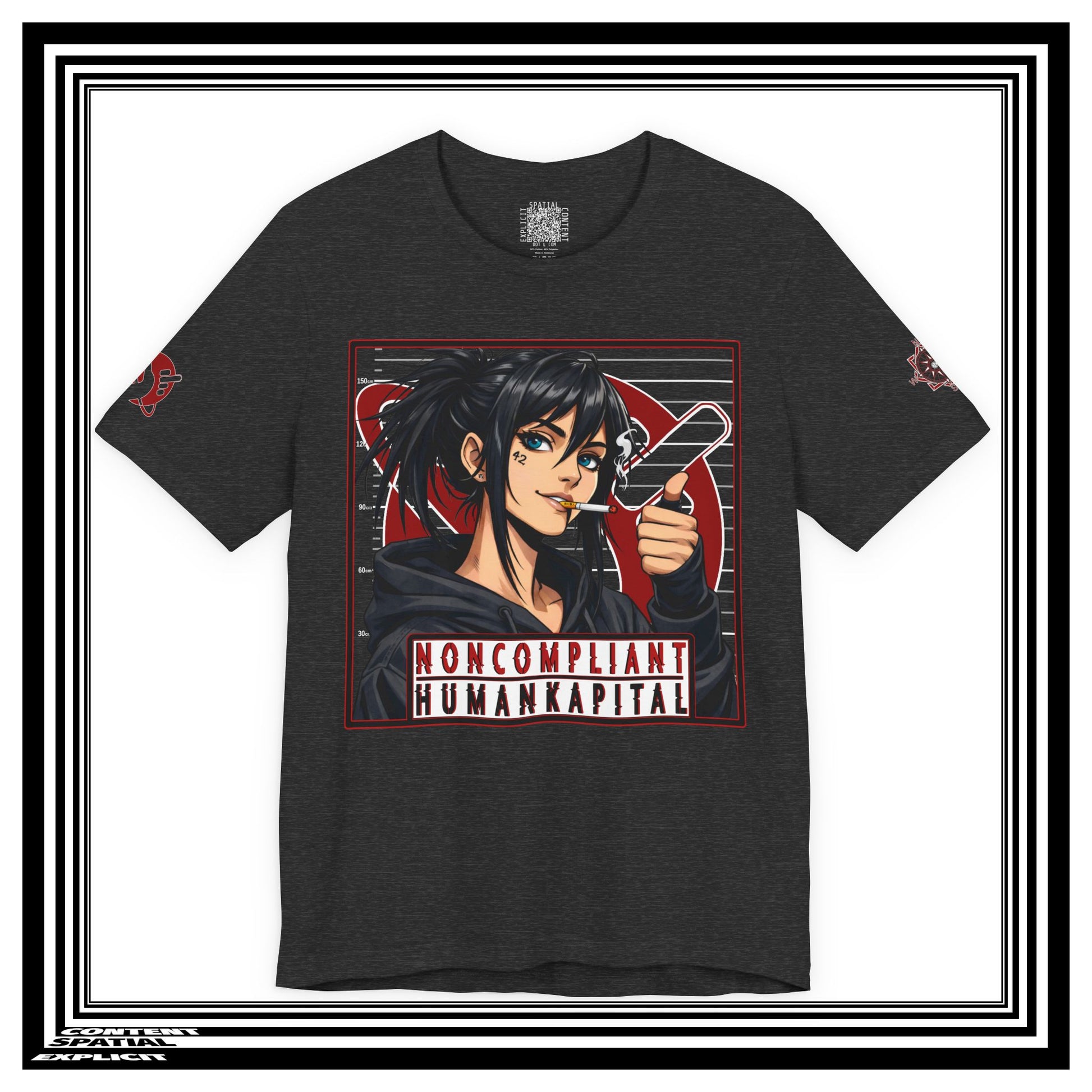 This lightweight crew-neck tee blends street-ready edge with anime-inspired attitude. Made from soft Airlume combed ring-spun cotton, it sits with a retail fit that layers cleanly under jackets or stands alone as a statement piece. The front holds a small, low-contrast motif while the back features a bold illustrated portrait framed in graphic red and black, captioned “NONCOMPLIANT HUMANKAPITAL.” Subtle sleeve graphics continue the visual story. Built with reinforced side seams, ribbed collar, shoulder tape and a tear-away label for comfort, it’s made and sourced with ethical manufacturing standards and REACH certification. Wear it to show quiet defiance and a taste for illustrative, subcultural design.