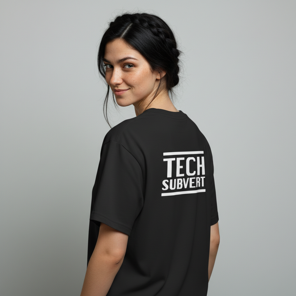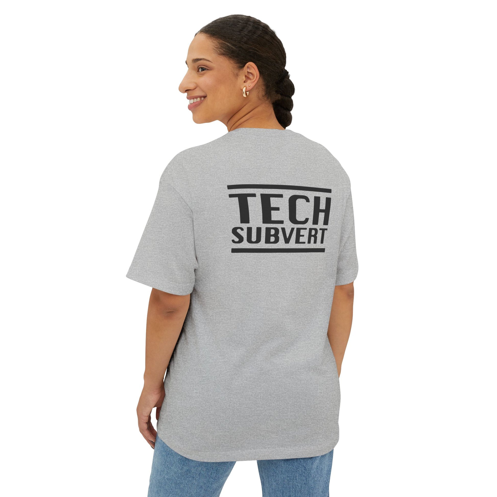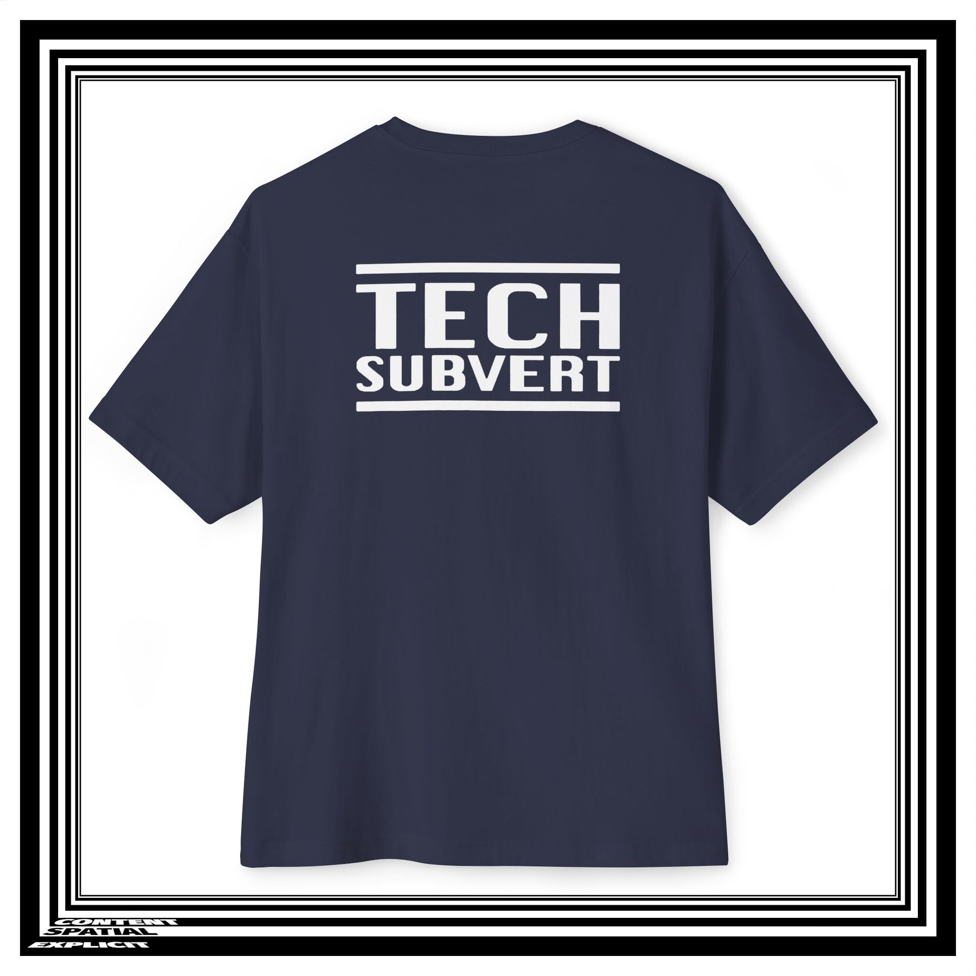 This oversized boxy tee features a name tag with the name "Not Important" on the front and clever parody design with the words 'TECH SUBVERT' in a bold, all-caps typeface on the back, creating a playful rebellion against the typical 'Tech Support' aesthetic. The relaxed fit and durable construction make it perfect for tech-savvy individuals looking to add a touch of humor to their wardrobe. Ideal for tech enthusiasts, rebels, and those who appreciate ironic messaging. Perfect for casual wear, tech-related events, and as a unique gift for those who appreciate quirky fashion.