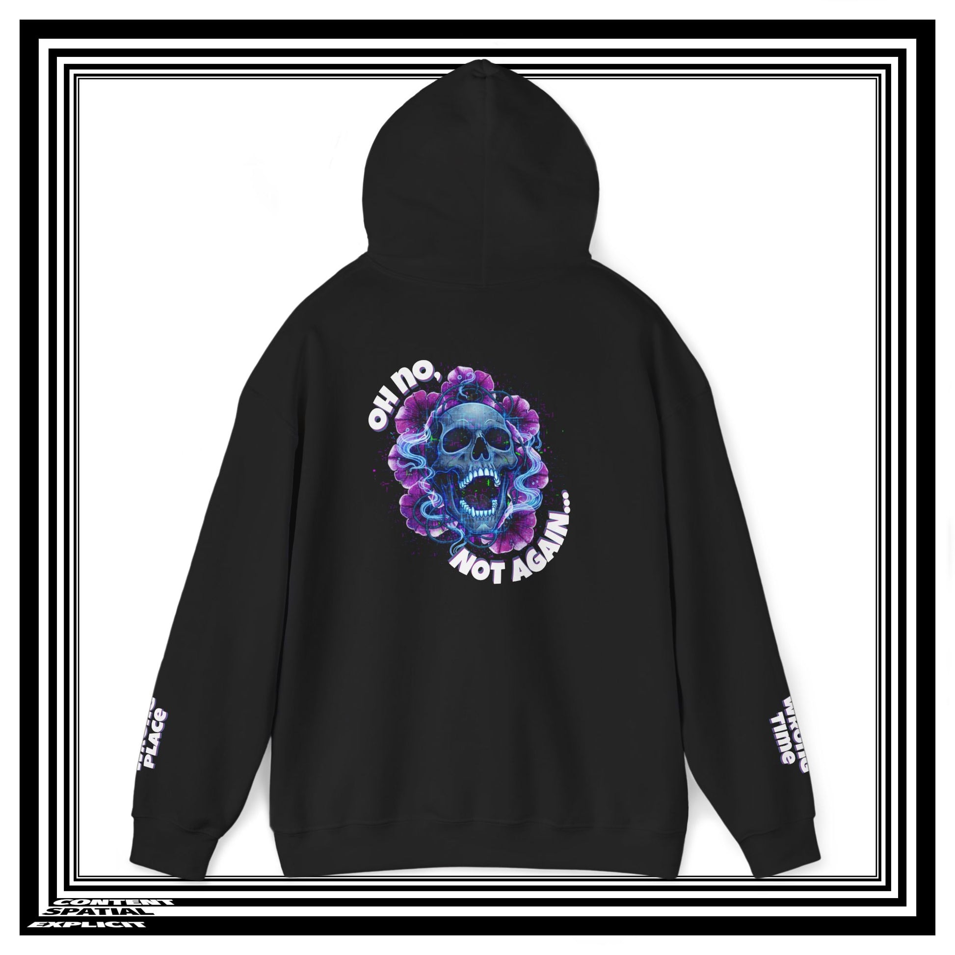 A midweight, black hooded sweatshirt with a moody, vaporwave skull design that reads like a late-night anthem. The front carries a small, geometric emblem in neon blues and purples; the back explodes into a larger, painterly skull surrounded by smoky violet and electric teal accents. It feels like stepping into a dim arcade or a rooftop at 2 a.m.—comfortable and slightly rebellious. The roomy kangaroo pocket and drawstring hood keep you warm while the smooth 50/50 cotton-poly blend holds vibrant prints without fading. Wear it to shows, late-night drives, or when you want an effortless statement piece that reads both nostalgic and modern.