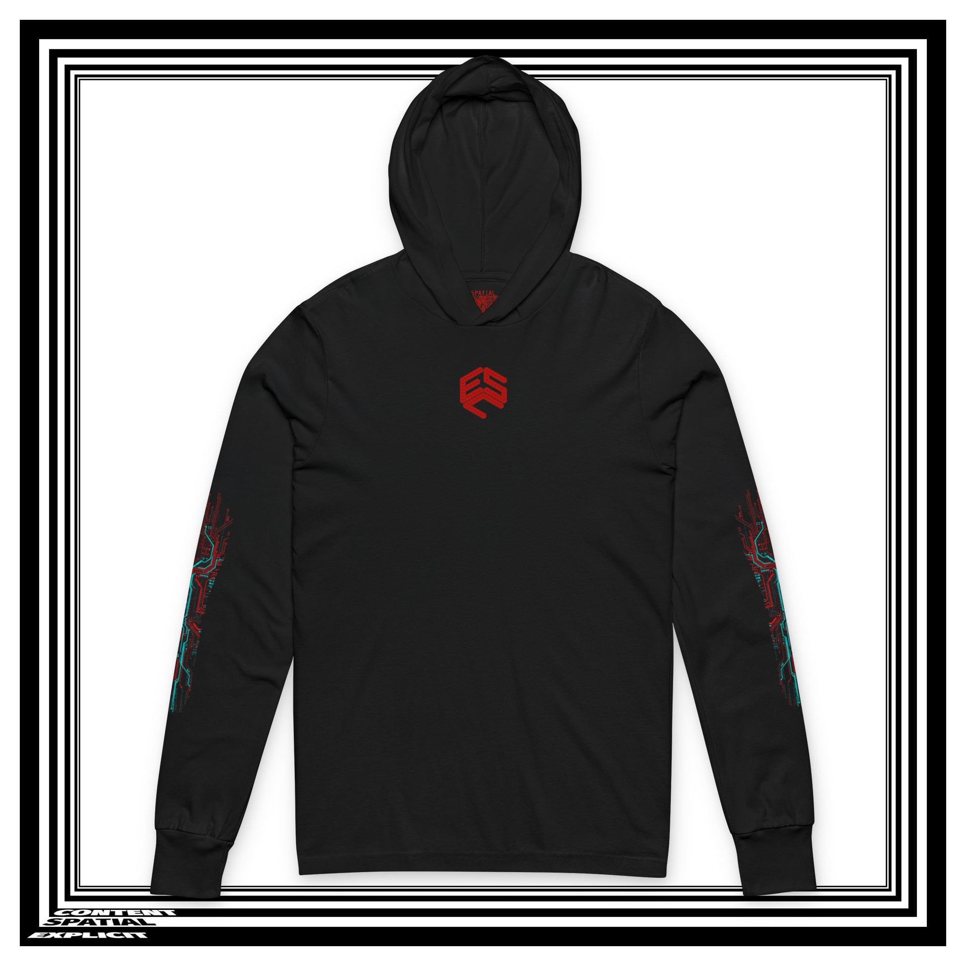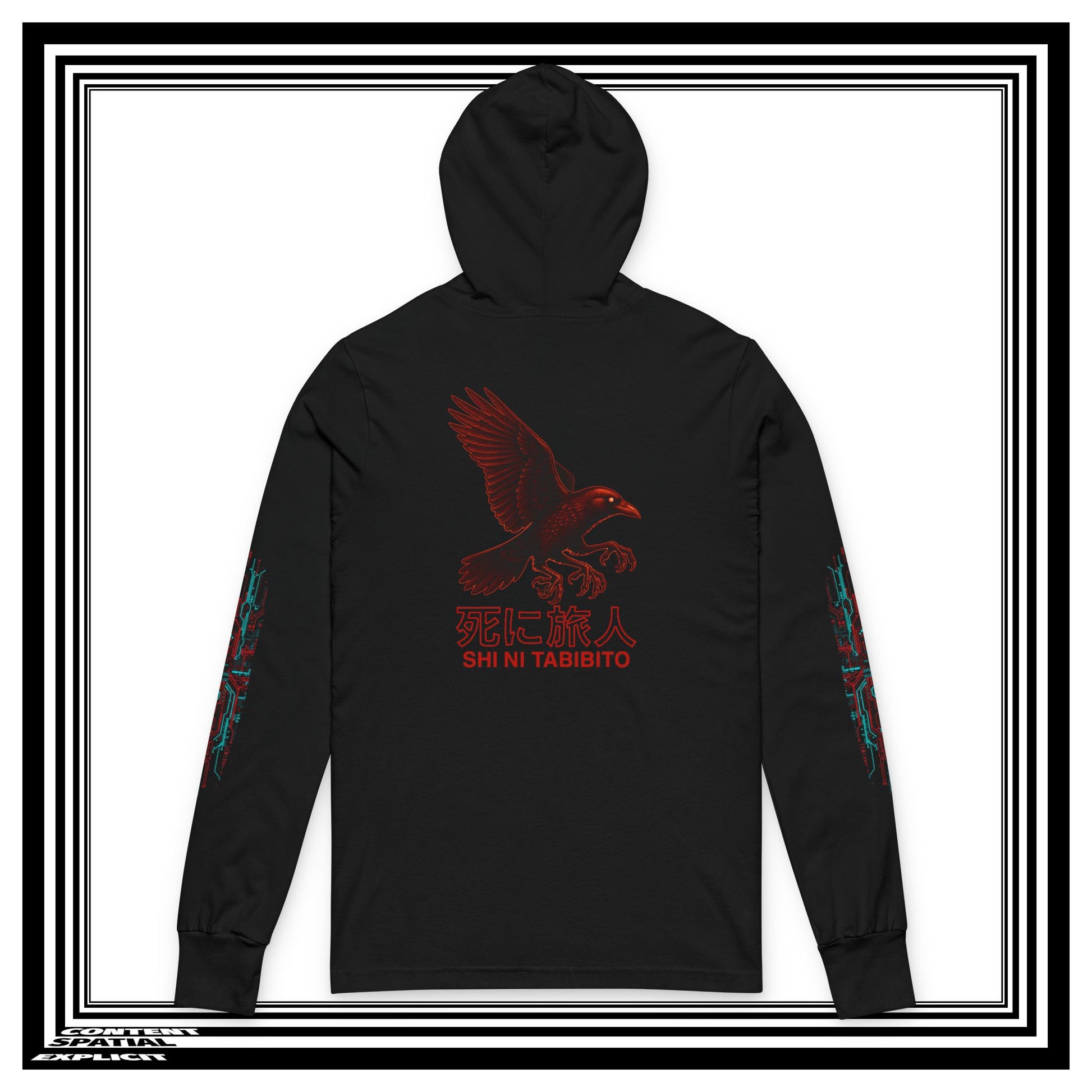A striking black Unisex Hooded Long Sleeve Tee featuring a vivid red glow surrounding a powerful, three-legged black raven (Yatagarasu) on the back. Below the raven, the Japanese phrase '死に旅人' (Shi Ni Tabibito), meaning 'Traveler to Death,' is displayed in bold red kanji with its English transliteration. The front of the hoodie features a subtle, minimalist red emblem of 'Explicit Spatial Content,' symbolizing unique individual existence within a broader network. This hoodie exudes a mysterious and edgy vibe, perfect for those drawn to Japanese culture and symbolism. Ideal for anyone looking to make a bold statement and stand out from the crowd. Perfect for fans of dark and unique fashion, as well as those who appreciate intricate designs and meanings.